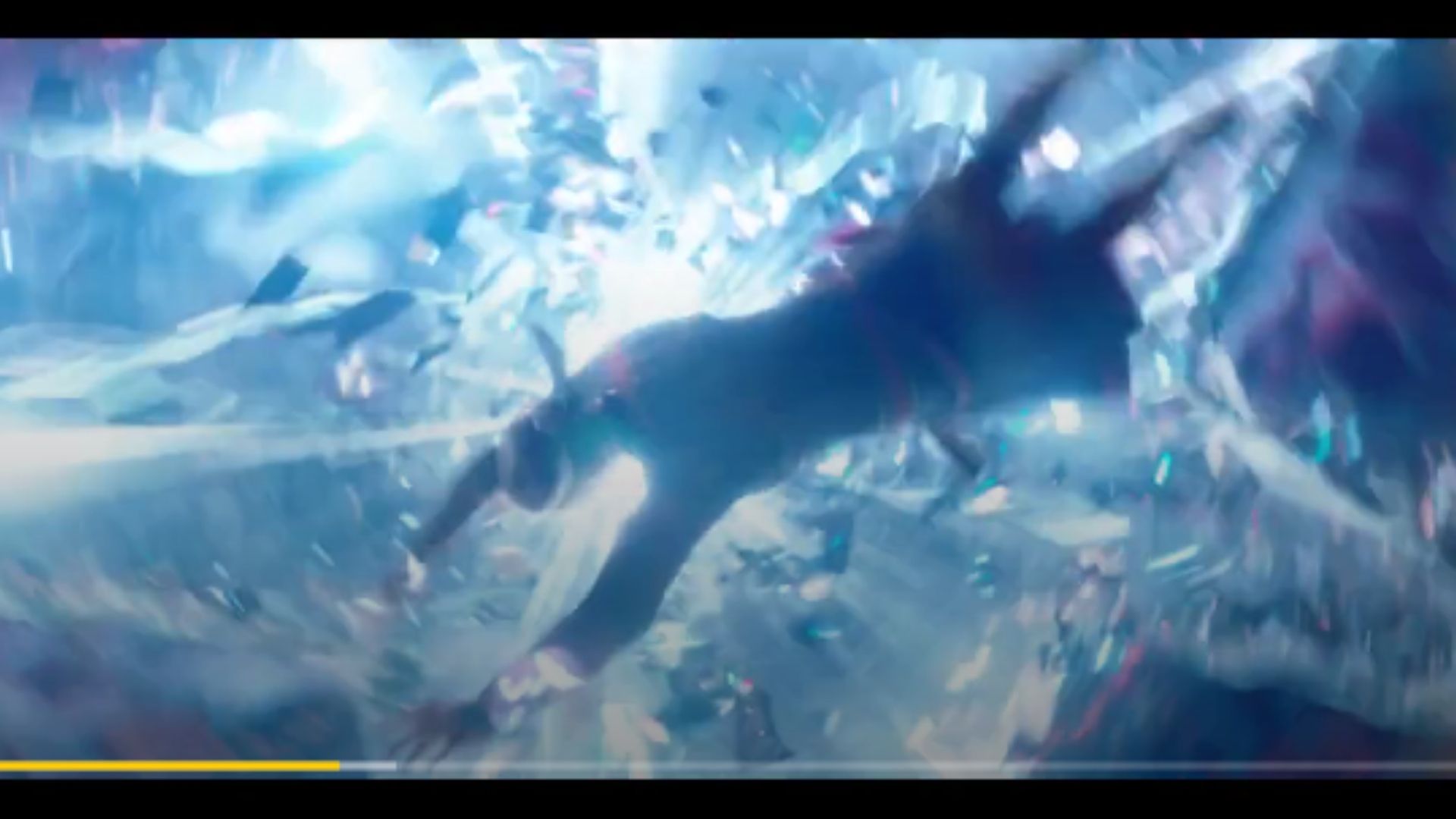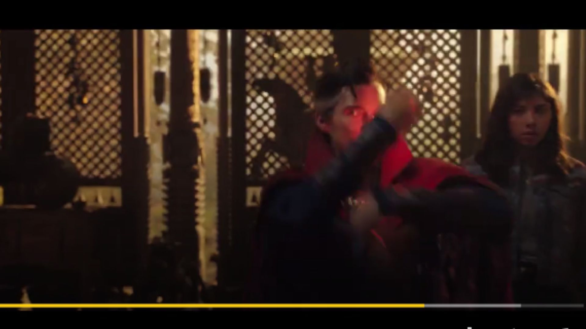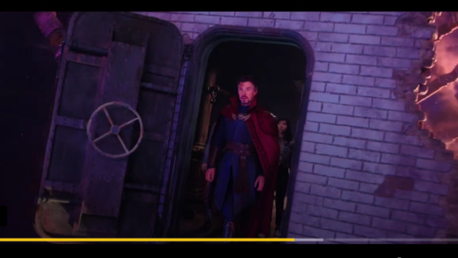 A heroína apareceu nas filmagens com algumas das características clássicas: a jaqueta jeans com uma grande estrela nas costas, a energia correndo pelas mãos e a companhia do Doutor Estranho quando eles abrem a porta mágica. São pequenos flashes, confira os prints: