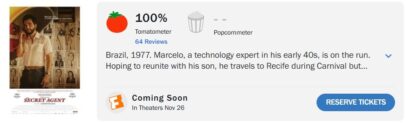 Cinco meses após estrear no Festival de Cannes, de onde saiu premiado, O Agente Secreto, novo filme de Kleber Mendonça Filho (Bacurau) estrelado por Wagner Moura (Guerra Civil), que deve representar o Brasil no Oscar 2026, segue com 100% de aprovação da crítica internacional no Rotten Tomatoes.
