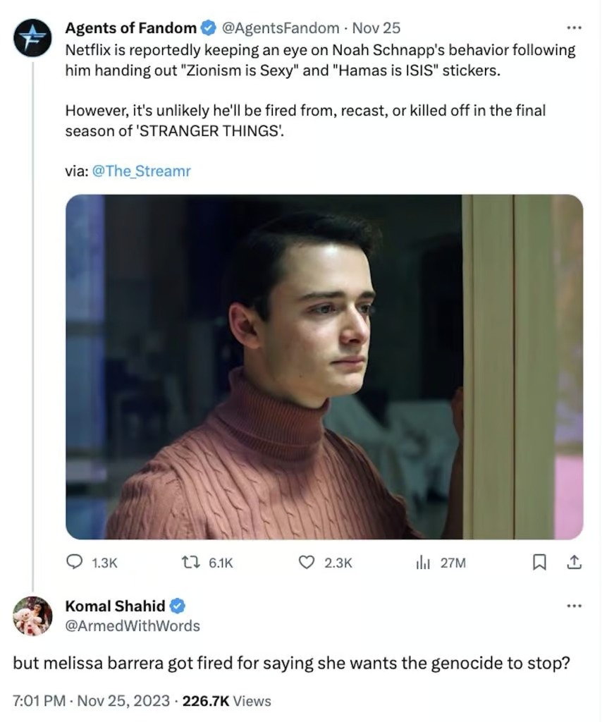“Se lembram de quanto Noah Schnapp estava distribuindo adesivos de ‘sionismo é sexy” com seus amigos e o quanto ele nunca enfrentou consequências, apesar os mais de 15 mil palestinos mortos àquela altura?”, diz um post.