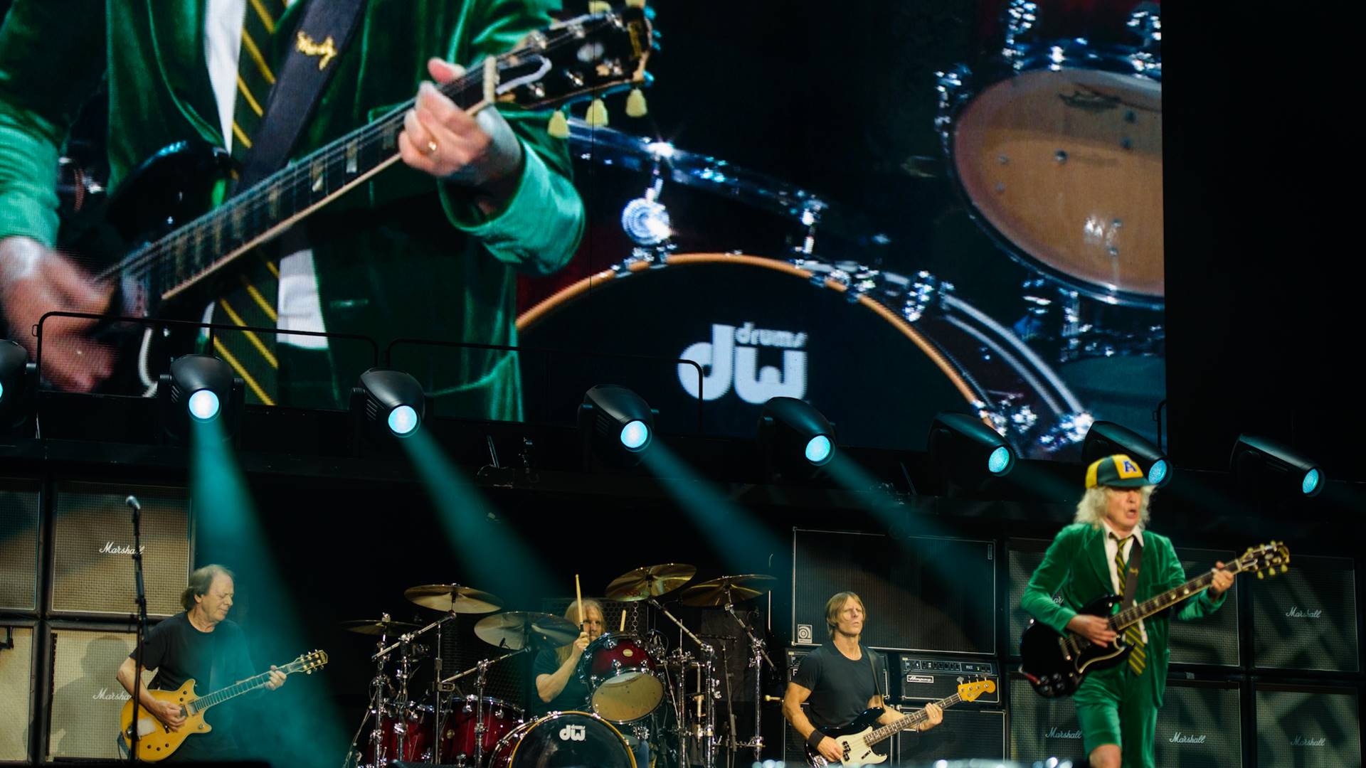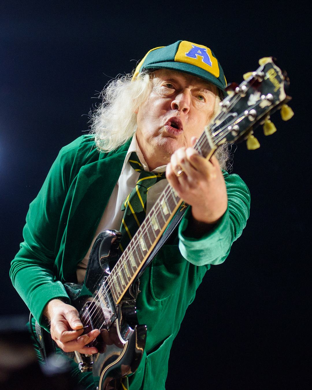 Angus Young, por aqui trajado com uniforme escolar na cor verde e chapéu com as cores da bandeira do Brasil, é a prova disso. Em alguns momentos engole uma ou outra nota na guitarra; mais perceptivelmente na introdução de “Thunderstruck”, tocada de modo desacelerado e comprovando como ele e seus colegas não usam metrônomo ao vivo (assim como em estúdio), mas ninguém liga. Diferentemente do que alguns vídeos em redes sociais levam a crer, o músico acerta muito mais do que erra. Pode ser que poupe energia no início ou simplesmente precise de aquecimento, entretanto, passados os primeiros 30 minutos de set, engrena de vez. E não para. Mesmo.