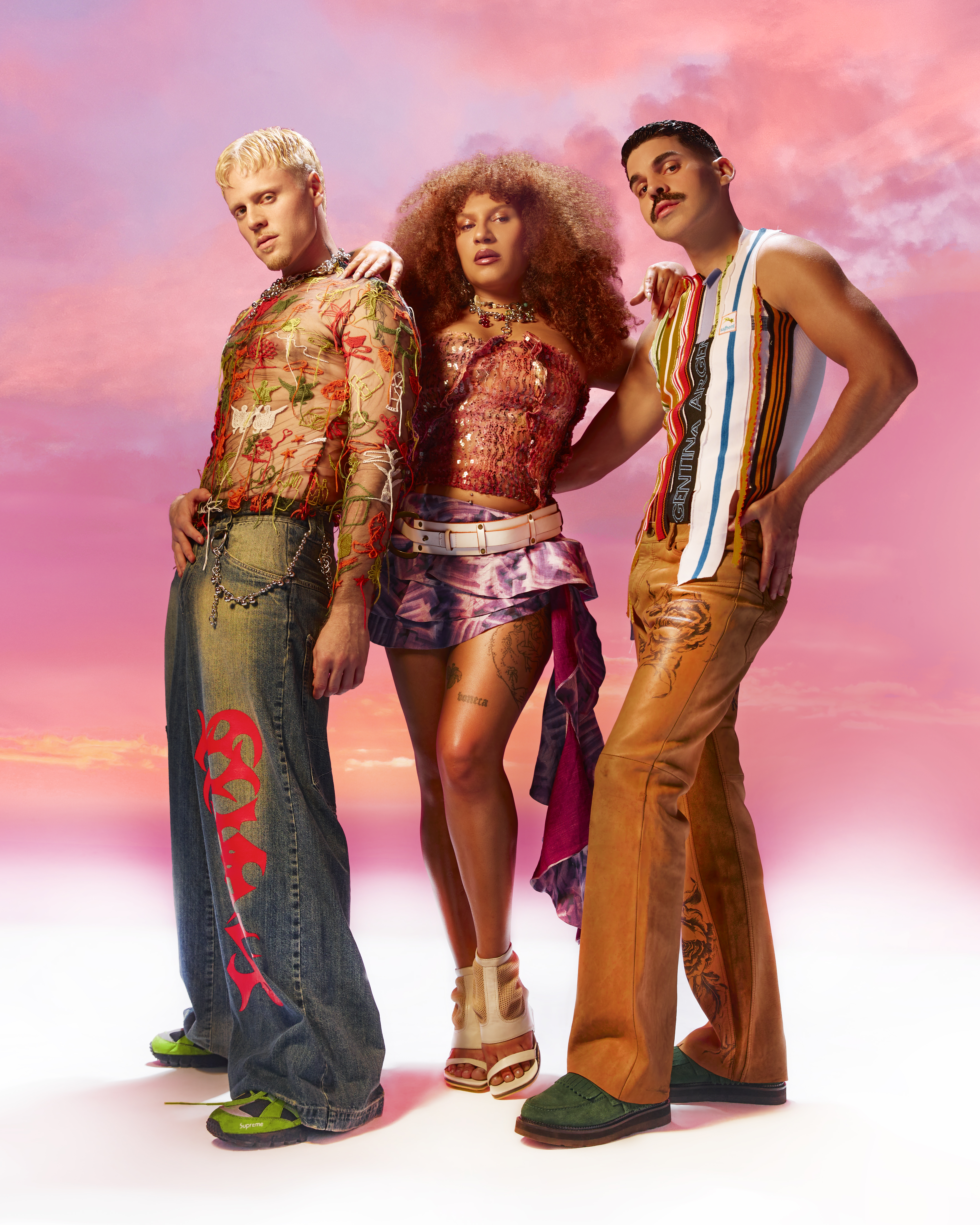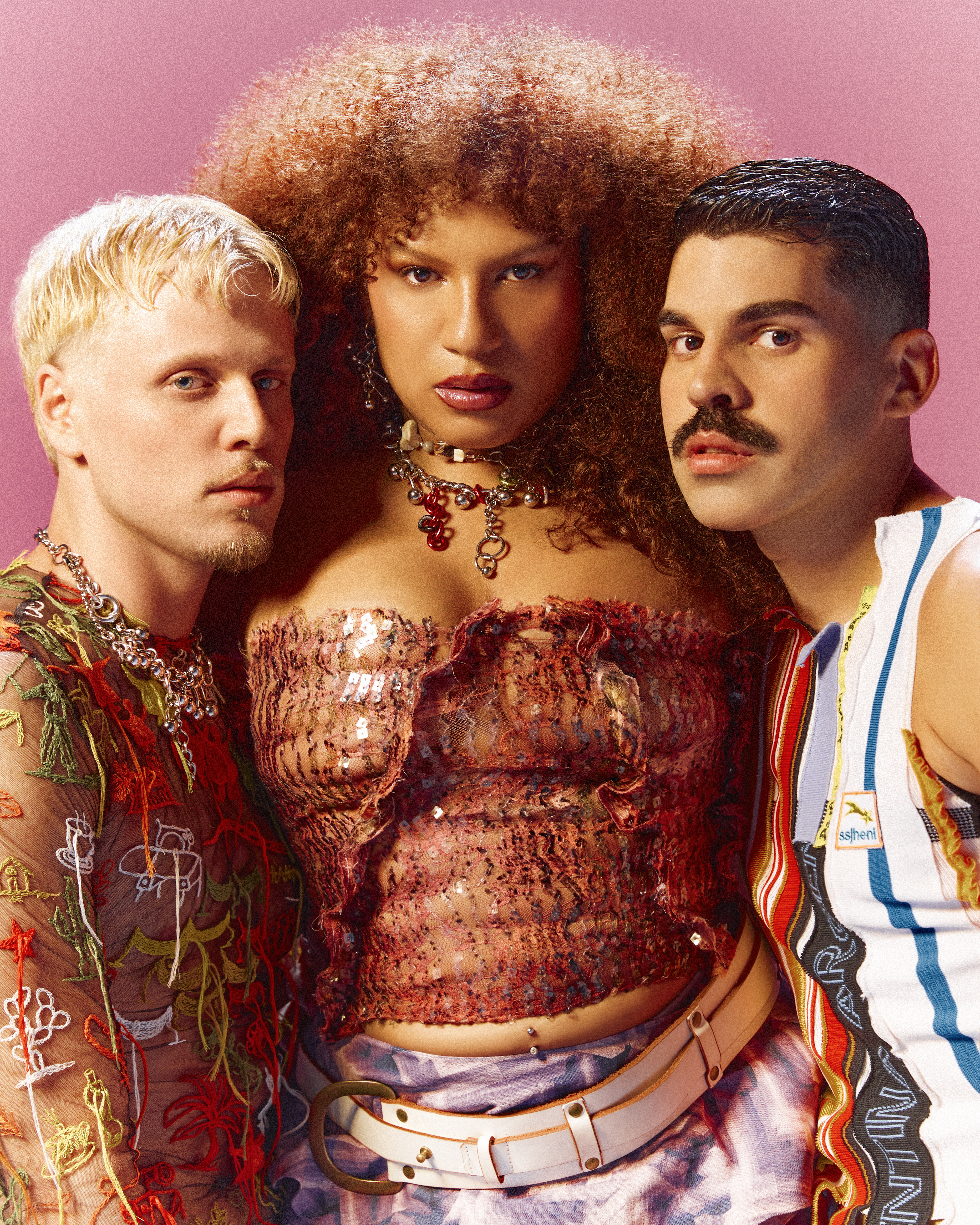 Sobre o que têm consumido, eles flutuam entre o alternativo — Davi cita Caroline Polachek, Björk e Allie X, por exemplo. Mel fala de Dua Lipa e Kali Uchis. E Mateus cita Nadson O Ferinha. Outros nomes das playlists do trio são Luiza Lian e Mc RB KBLZ, “Mas estamos enraizados, uma dica que eu dou é: Brasil profundo,” diz Mateus.