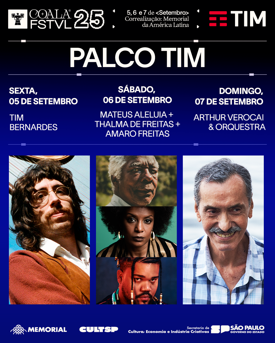 A experiência musical única do Coala Festival 2025 ganha ainda mais profundidade com a programação do Palco TIM, que ocupa novamente o Auditório Simón Bolívar, no Memorial da América Latina, em São Paulo. O espaço receberá três shows exclusivos e imersivos de artistas consagrados da música brasileira: Tim Bernardes (5/9), Arthur Verocai (6/9) e a união de Mateus Aleluia, Thalma de Freitas e Amaro Freitas (7/9).