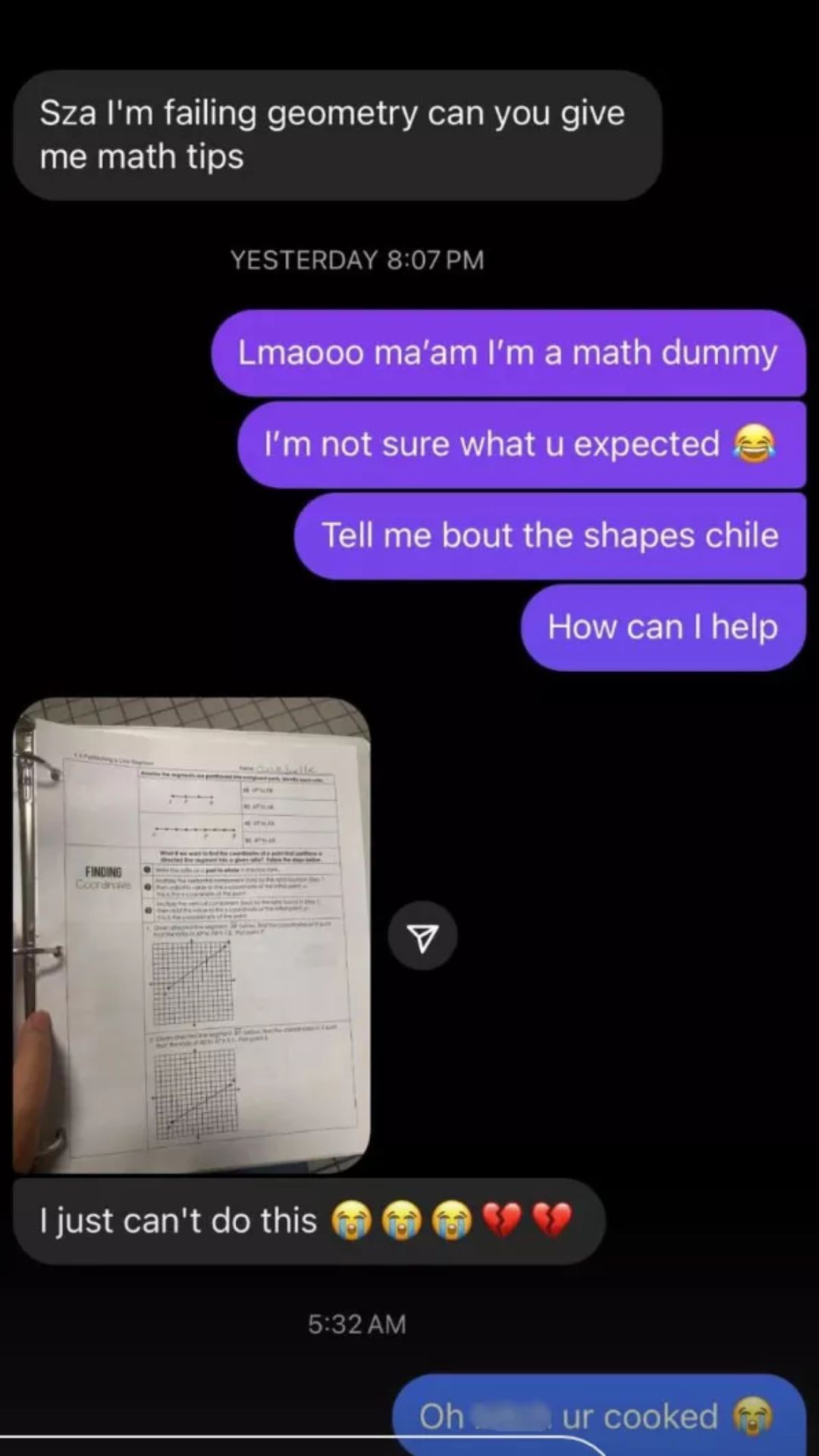 Sza não é boa em matemática. Ela compartilhou um story no Instagram na última quarta-feira, 28, mostrando uma captura de tela de uma conversa com um fã que pediu a ela ajuda com a lição de casa.
