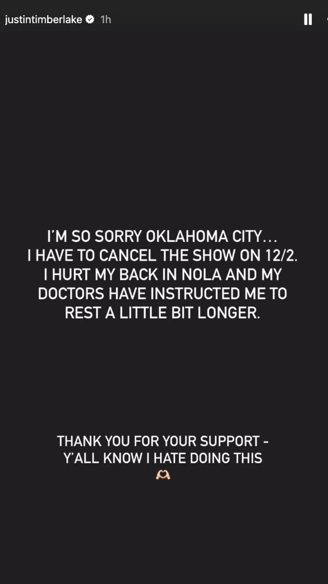 Justin Timberlake precisou cancelar outro show. Dessa vez, ele afirmou que não poderia se apresentar em Oklahoma, nos Estados Unidos, nesta segunda-feira, 2, devido a uma lesão nas costas.