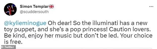 @kylieminogue Minha nossa! Então os Illuminati têm um novo fantoche, e ela é uma princesa pop! Cuidado, lovers! Sejam gentis, aproveitem a música dela, mas não se deixem levar. Sua escolha é livre.
