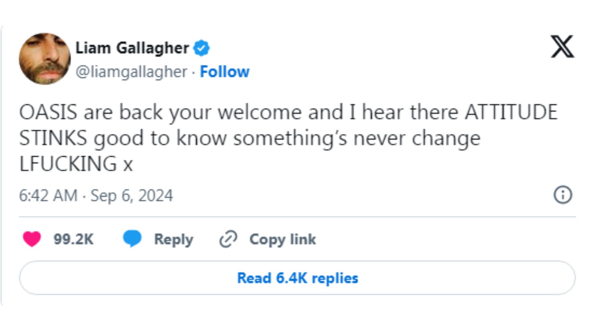 Liam não se sentiu inibido pela indignação dos próprios fãs e disse: “Oasis está de volta. De nada. E eu ouvi que a atitude deles fede. Bom saber. Algumas coisas nunca mudam”.