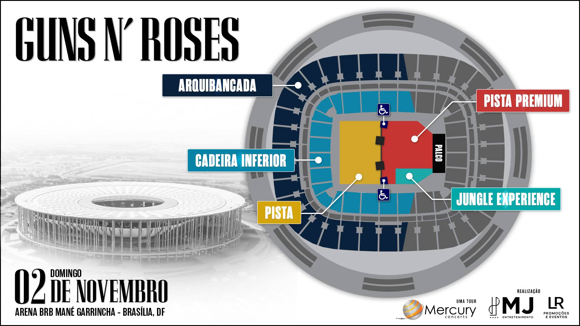 No show do Guns N’ Roses em Brasília, o pit, chamado de Jungle Experience — com open bar, camarote exclusivo e comida à vontade —, custa R$ 5.479.