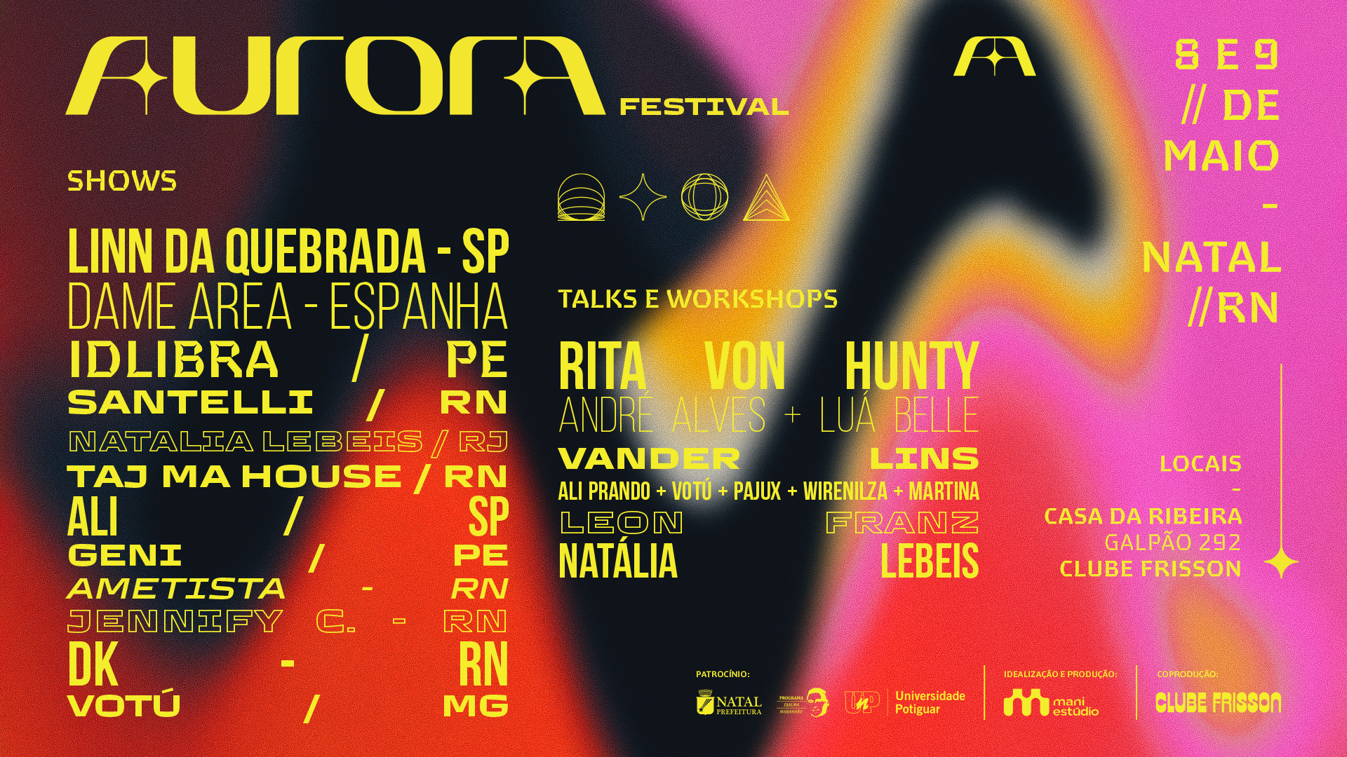 O AURORA conta com a participação de nomes de destaque no cenário internacional, como Linn da Quebrada, a DJ e produtora IDLIBRA — que fez parte do lineup do Lollapalooza Brasil 2026 — o próprio Ali Prando e a dupla espanhola Dame Area, que acaba de se apresentar no Primavera Sound. Outros artistas confirmados são o mineiro Votú e os natalenses Taj Ma House, SANTELLI, GENI, Ametista, Jennify C. e DK.