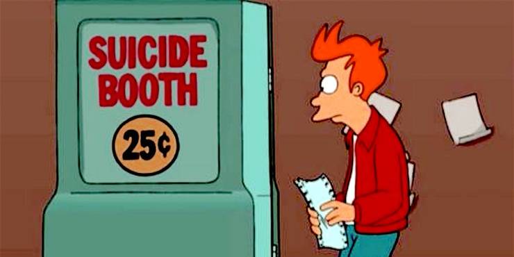 É possível cometer suicídio na rua em Futurama, numa cabine que cobra apenas 25 centavos. Isso porque, por um tempo, o ato de cometer suicídio foi um crime e, portanto, tentativas fracassadas podem ser punidas nos termos da lei.