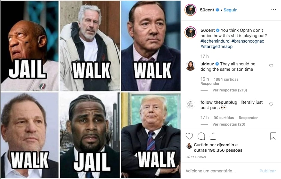 Além disso, 50 Cent publicou uma montagem com seis homens famosos também acusados de assédio sexual ou estupro. Na foto, ele argumentou que apenas os negros foram condenados, e dentre os homens brancos “livres” estão Kevin Spacey e o presidente norte-americano Donald Trump.