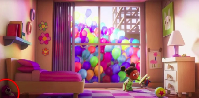 Talvez um dos easter eggs mais fáceis de encontrar seja o de Toy Story 3 (2010) em Up – Altas Aventuras (2009). Quando a casa do Sr. Fredricksen começa a flutuar, ela passa pelo quarto de uma menininha, no qual podemos ver o urso Lotso. Não sabemos se é o mesmo brinquedo malvado que tornou a vida de Woody mais difícil, mas você pode vê-lo sentado casualmente ao lado da cama.