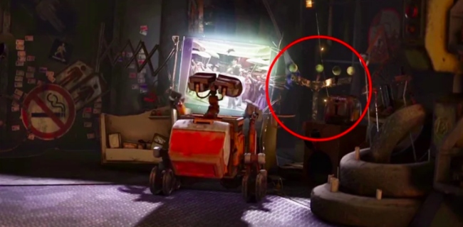 WALL-E (2008) passou grande parte da vida cercado de lixo. No meio da sucata que ele mantinha em casa, podemos ver a bengala de Carl Fredricksen, personagem central de UP – Altas Aventuras (2009). Ela pode ser vista enquanto o robô futurístico se prepara para assistir Hello, Dolly.