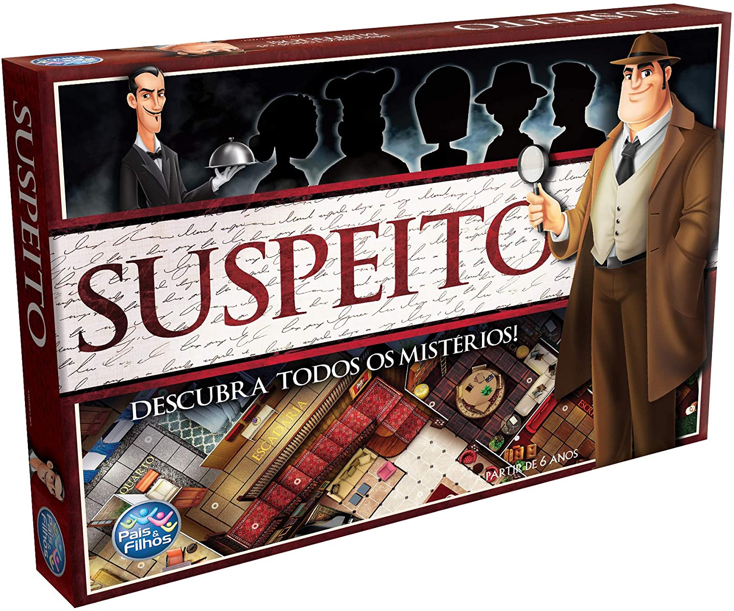 1. Pais & Filhos, Jogo de Tabuleiro Suspeito: No início do jogo, sem que ninguém veja, são sorteadas e separadas 3 cartas: 1 suspeito, 1 arma e 1 local. Essas cartas vão definir o que realmente aconteceu no crime, e o objetivo do jogo é desvendá-lo. – https://amzn.to/3cf6rJq