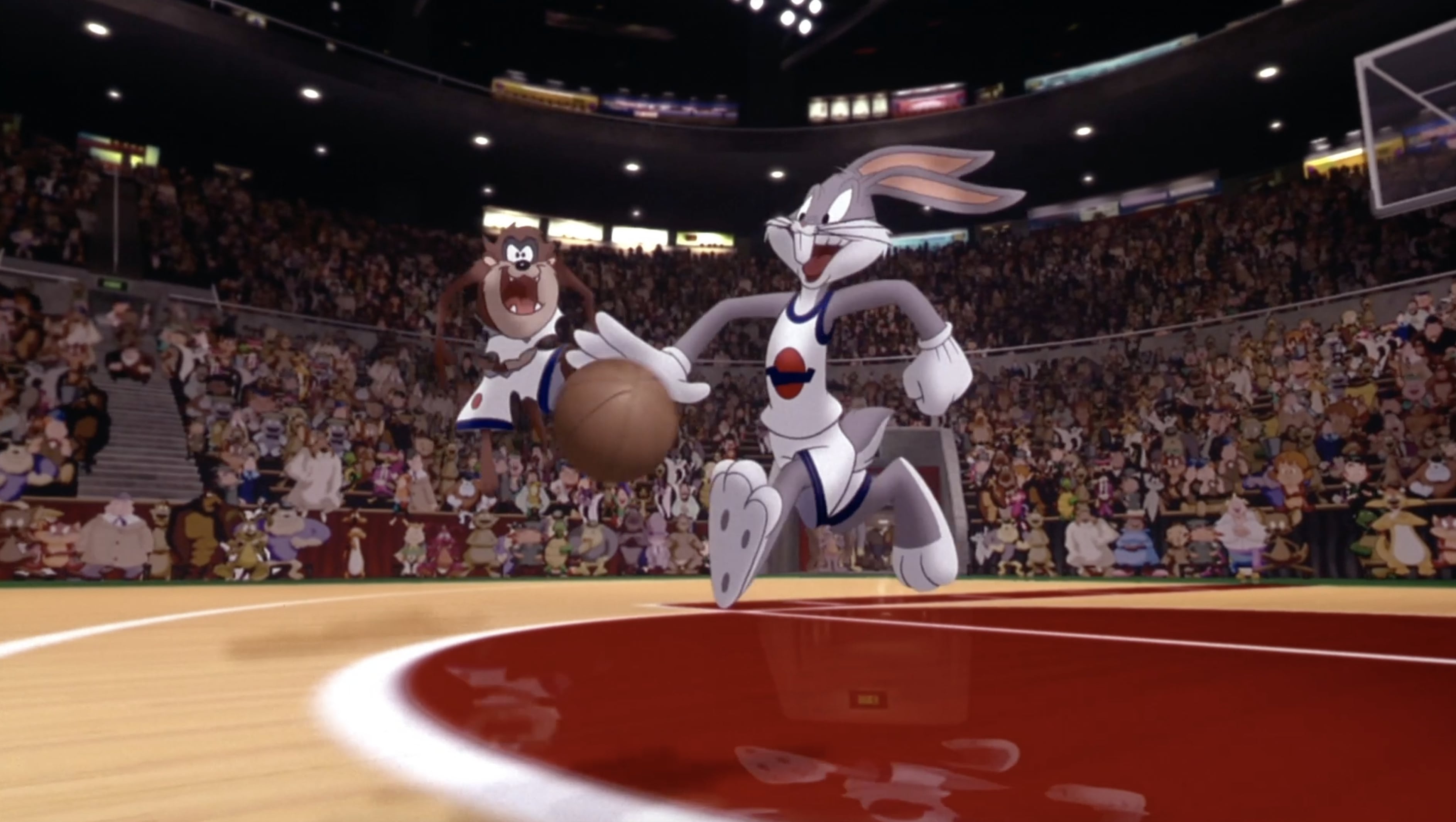 Para quem não se lembra, o filme mostra um maldoso alienígena, proprietário de um parque, que precisa de uma nova atração no Moron Mountain. Quando a gangue dele, os Nerdlucks, vem para a Terra para sequestrarem Pernalonga e os Looney Tunes, o coelho os desafia com um jogo de basquete para determinar os destinos.