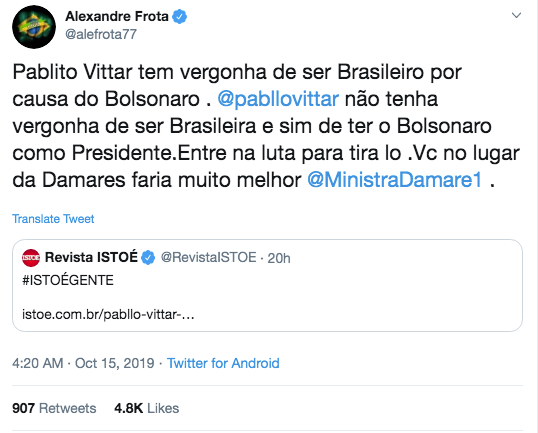 “Pablito Vittar tem vergonha de ser Brasileiro por causa do Bolsonaro . @pabllovittar não tenha vergonha de ser Brasileira e sim de ter o Bolsonaro como Presidente. Entre na luta para tirá-lo. Você no lugar da Damares [Ministra da Mulher, da Família e dos Direitos Humanos] faria muito melhor.”