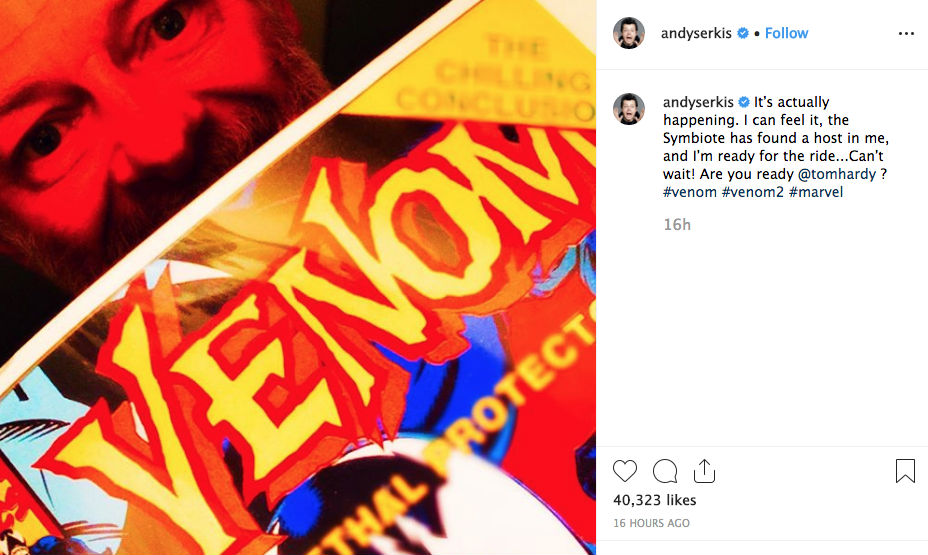 Na última segunda, 5, Andy Serkis revelou em seu Instagram que será o diretor responsável pela continuação de Venom, filme lançado em outubro de 2018 e estrelado por Tom Hardy.