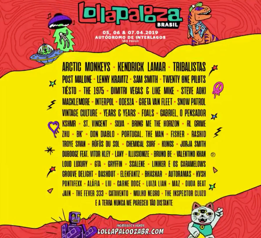 Finalmente saiu! A espera acabou! Foi divulgado o line up oficial do Lollapalooza Brasil 2019. O festival, que vai acontecer nos dias 5, 6 e 7 de abril do ano que vem, terá como atrações principais os britânicos do Arctic Monkeys, o rapper Kendrick Lamar e os Tribalistas.