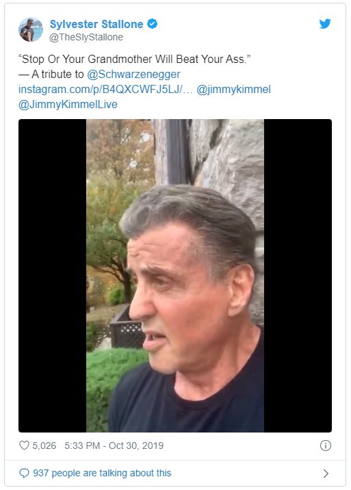 Como a rivalidade entre os dois nunca morreu, apesar de atualmente ser uma troca de brincadeiras entre os atores, Sylvester Stallone retrucou no Twitter, e disse: “Para você, meu amigo, eu escrevi uma continuação de Pare! Senão Mamãe Atira, e se chama ‘Pare, ou sua avó vai te dar uma surra’, e eu vou produzir e dirigir.”