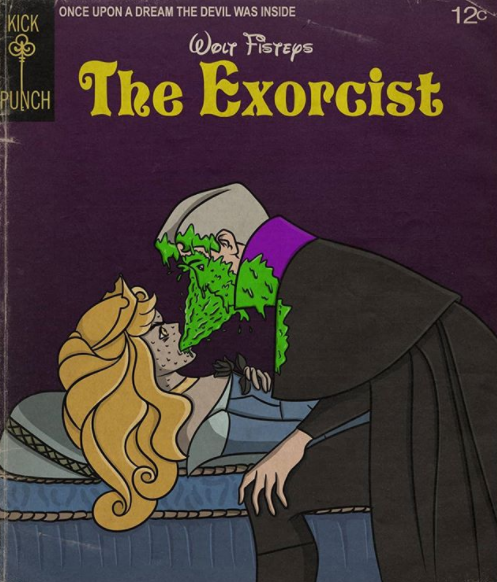 A Bela Adormecida se encontra com O Exocista e a princesa aparece possuída por um demônio, enquanto o Príncipe se torna um padre. Para deixar a ilustração mais estranha, a protagonista vomita no amado. A legenda da foto diz: “Era uma vez o diabo estava dentro”. Veja: