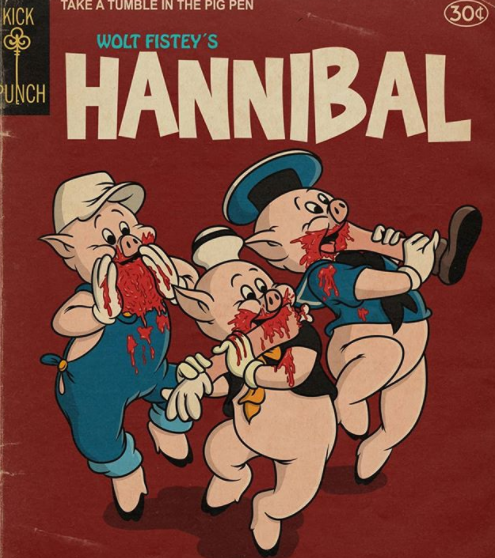 A nova versão de Hannibal é um dos pôsteres mais assustadores e bizarros. Nela, os Três porquinhos não são ameaçados pelo Lobo Mau, mas sim são os predadores. Na imagem, os três aparecem se alimentando de partes de outros animais.