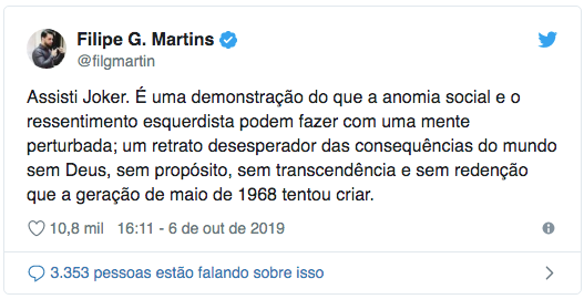 Martins também escreveu que Joker é “um retrato desesperador das consequências do mundo sem Deus, sem propósito, sem transcendência e sem redenção que a geração de maio de 1968 tentou criar.”