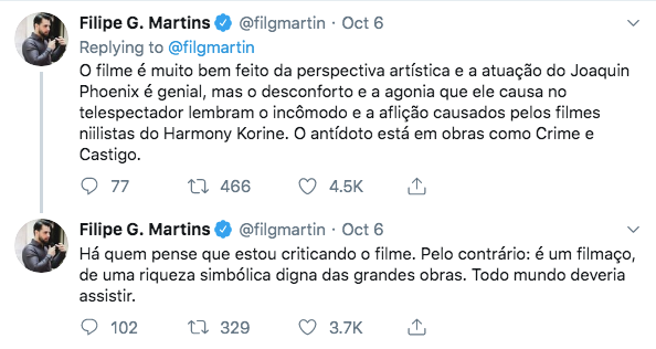 No Twitter, o analista político revelou suas impressões sobre o filme, dizendo que ele demonstra o que a anomia social e o “ressentimento esquerdista” são capazes de fazer com uma “mente perturbada.”