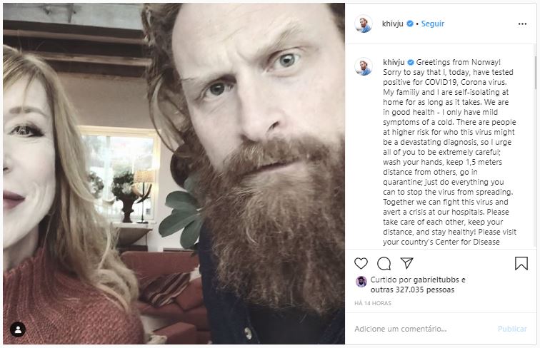 “Lamento dizer que, hoje, testei positivo para o COVID19, coronavírus”, escreveu Hivju. “Minha família e eu estamos nos isolando em casa pelo tempo que for preciso. Nossa saúde está boa – só tenho leves sintomas de resfriado.”