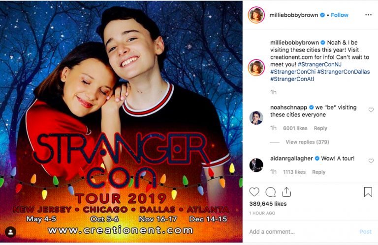 Parte do elenco de Stranger Things vai fazer uma turnê em homenagem à série. Millie Bobby Brown (a Eleven) e Noah Schnapp (o Will Byers) passarão por 4 cidades estadunidenses para conhecer os fãs e conversar sobre o passado, presente, futuro do programa.