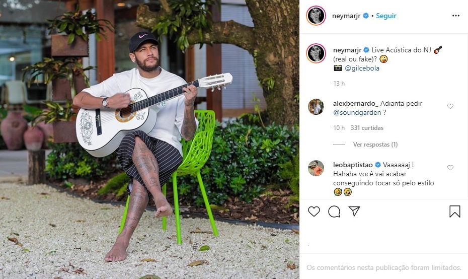 Na legenda da postagem, Neymar escreveu: “Live Acústica. do NJ (real ou fake)?”. O atleta está isolado na mansão dele em Mangaratiba, litoral do Rio de Janeiro.