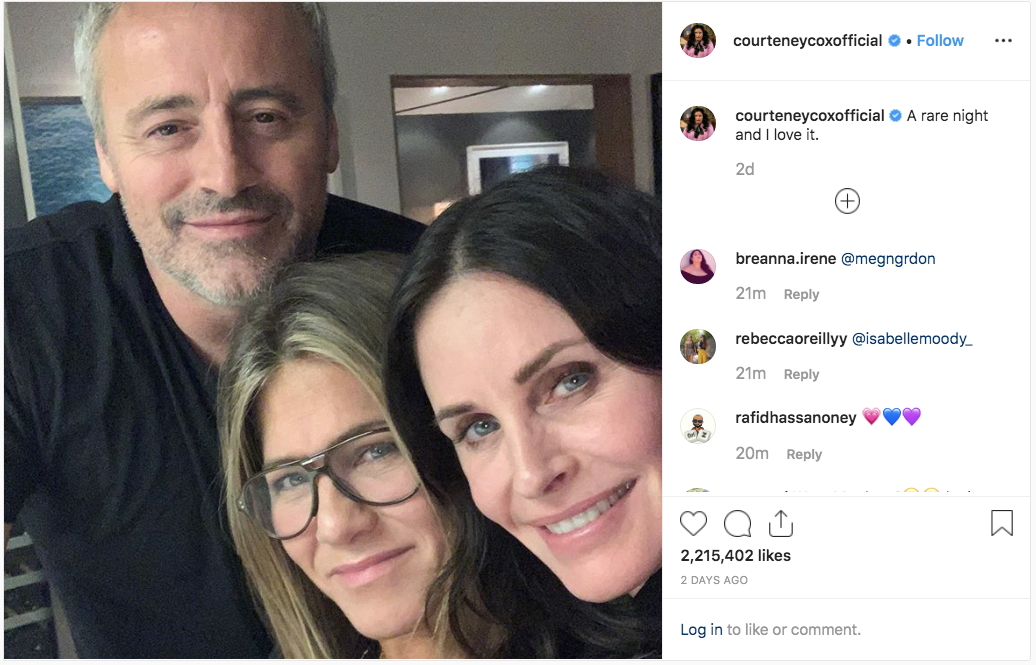 Courteney Cox compartilhou uma foto ao lado de Jennifer Aniston e Matt LeBlanc, ex-colegas de elenco