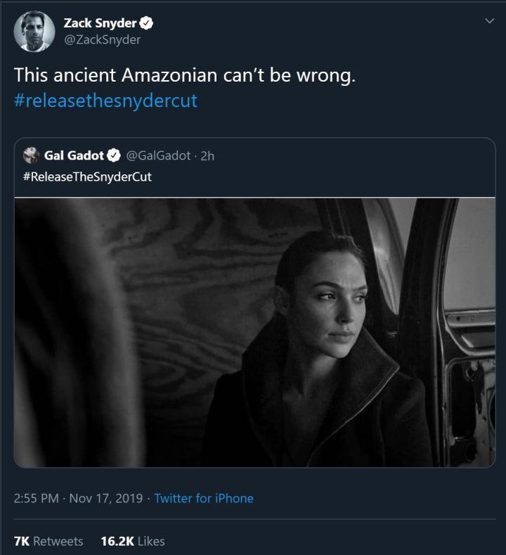 Entretanto, no domingo dia 17, vários atores entraram em peso na campanha. Uma das primeiras foi Gal Gadot, a Mulher Maravilha, que tuitou uma foto em preto e branco com a hashtag, a qual Snyder retuitou: