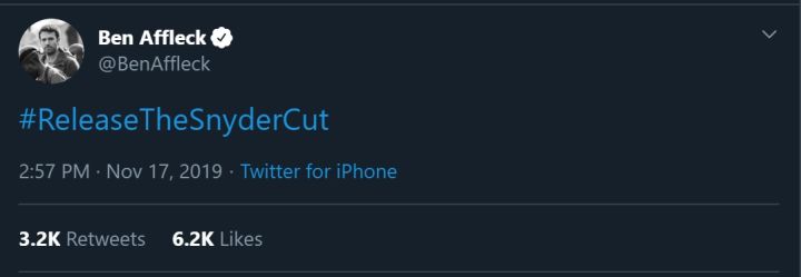 A hashtag “Release the Snyder Cut” foi tuitada por Ben Affleck, Gal Gadot, o próprio Zack Snyder e outros membros do elenco