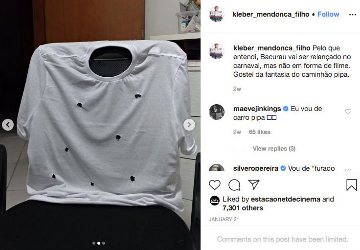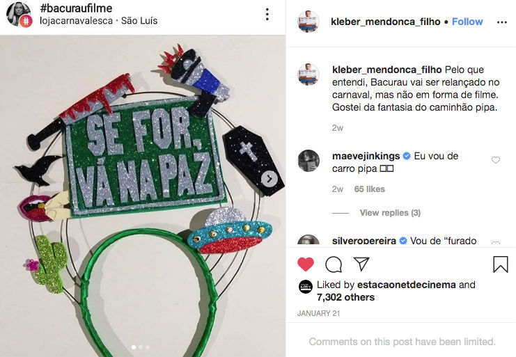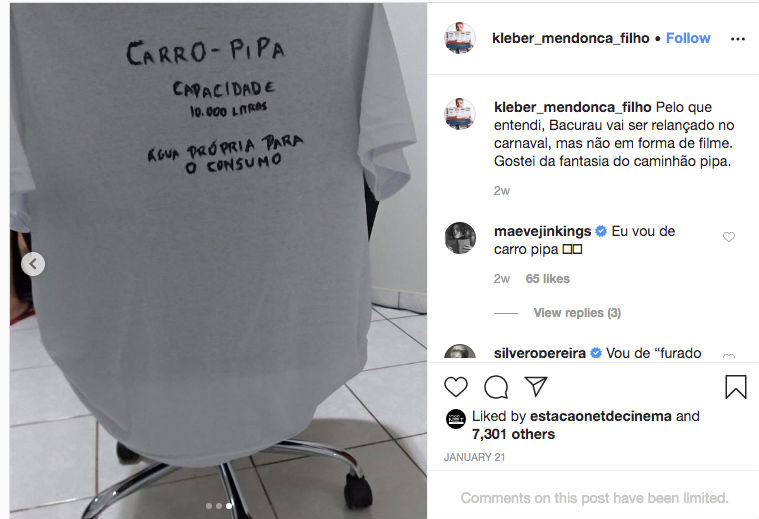 “Pelo que entendi, Bacurau vai ser relançado no Carnaval, mas não em forma de filme. Gostei da fantasia do caminhão pipa”, escreveu o cineasta.