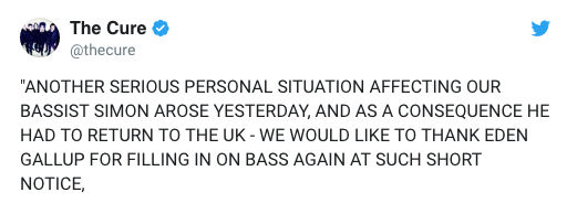 Na última sexta, 11, o baixista do The Cure, Simon Gallup, precisou voltar com urgência ao Reino Unido antes do show que a banda faria no dia seguinte como atração principal no festival Austin City Limits, nos Estados Unidos.