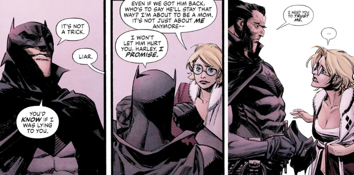Grávida de gêmeos do Coringa, Arlequina desiste da vida de vilã e passa a ajudar Batman na briga com o arqui-inimigo. Nos últimos acontecimentos, o herói revela a identidade secreta para ganhar a confiança da personagem.