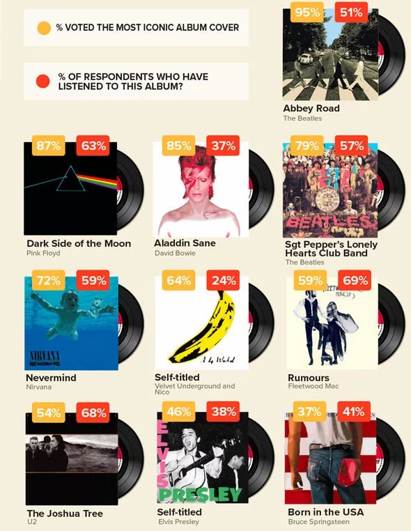 De acordo com o site, a pesquisa entrevistou mais de 4500 pessoas. Cada um escolheu as capas de disco favoritas entre as 100 mais icônicas de toda história. A arte de Abbey Road mostra John Lennon, Paul McCartney, George Harrison e Ringo Starr atravessando uma faixa de pedestres.
