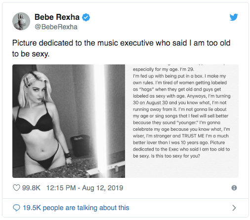 Na última segunda, 12, Bebe Rexha contou que um executivo de música – do sexo masculino – havia dito que ela não devia compartilhar imagens sensuais nas redes sociais.