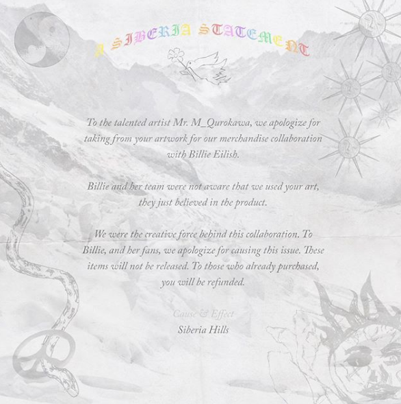“Para o artista talentoso Mr. M_Qurokawa, pedimos desculpas por usar a arte para a nossa colaboração de mercadorias com Billie Eilish”, escreveu.