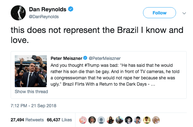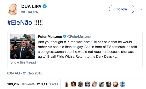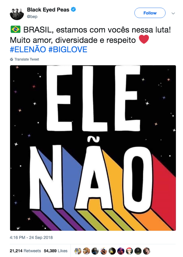 Na última segunda, 24, o Black Eyed Peas publicou no Twitter a hashtag #EleNão, demonstrando apoio ao movimento brasileiro que se tornou popular no último mês, e que se posiciona contra o candidato à presidencia Jair Bolsonaro.
