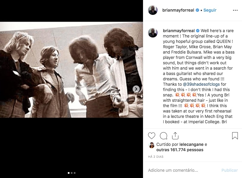 Na legenda, o guitarrista escreveu: “Bem, aqui está um momento raro! A formação original de um grupo esperançoso chamado Queen! Roger Taylor, Mike Grose, Brian May e Freddie Bulsara. Mike era um baixista de Cornualha [Inglaterra] com um som muito grande, mas as coisas não deram certo com ele e fomos procurar um baixista que compartilhou nossos sonhos. Adivinhe quem encontramos!!!”