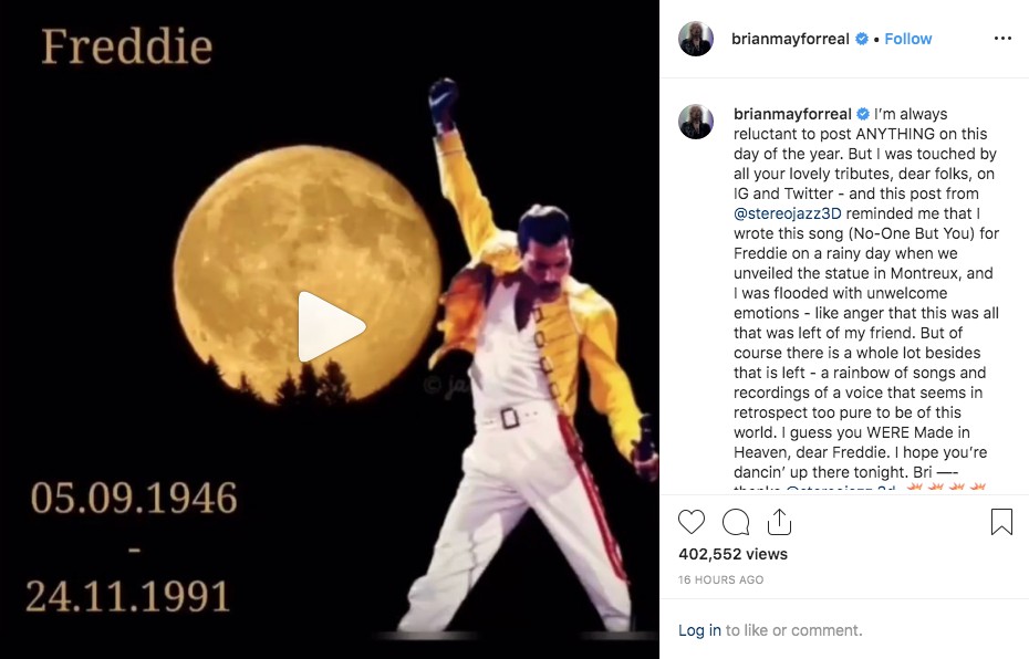 Em homenagem ao lendário vocalista do Queen, Brian May se manifestou nas redes sociais, publicando um texto no qual ele desabafa: “Eu sempre reluto em postar QUALQUER COISA neste dia do ano. Mas fui tocado pelos adoráveis tributos de pessoas queridas no Instagram e no Twitter – e uma publicação do @stereojazz3D me lembrou de quando escrevi a música [No-One But You] para Freddie num dia chuvoso. Nós inauguramos a estátua dele em Montreux, e eu fui inundado por emoções que não eram bem-vindas, como o ódio por aquilo ser a única coisa que sobrou do meu amigo.”