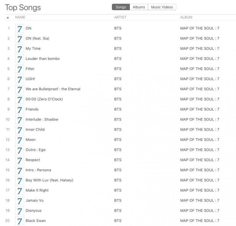 O BTS lançou nesta sexta, 21, o disco Map of the Soul: 7 que segue o lançamento de Map of the Soul: Persona. O novo álbum conta com 20 músicas – e todas alcançaram o top 20 do iTunes nos Estados Unidos em menos de 24 horas.
