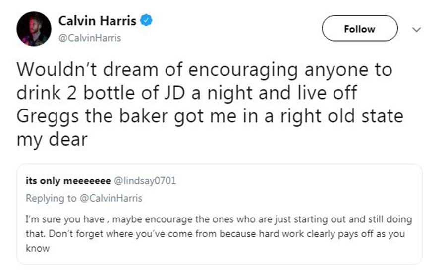Depois, na mesma conversa, Harris escreveu: “Não sonharia em encorajar alguém a beber duas garafas de Jack Daniels por noite e viver desta maneira. O Greggs me pegou de jeito, querida”.