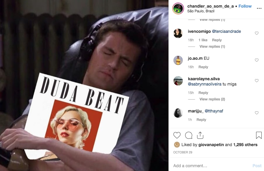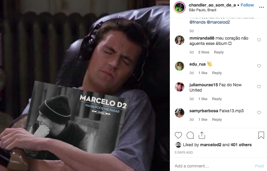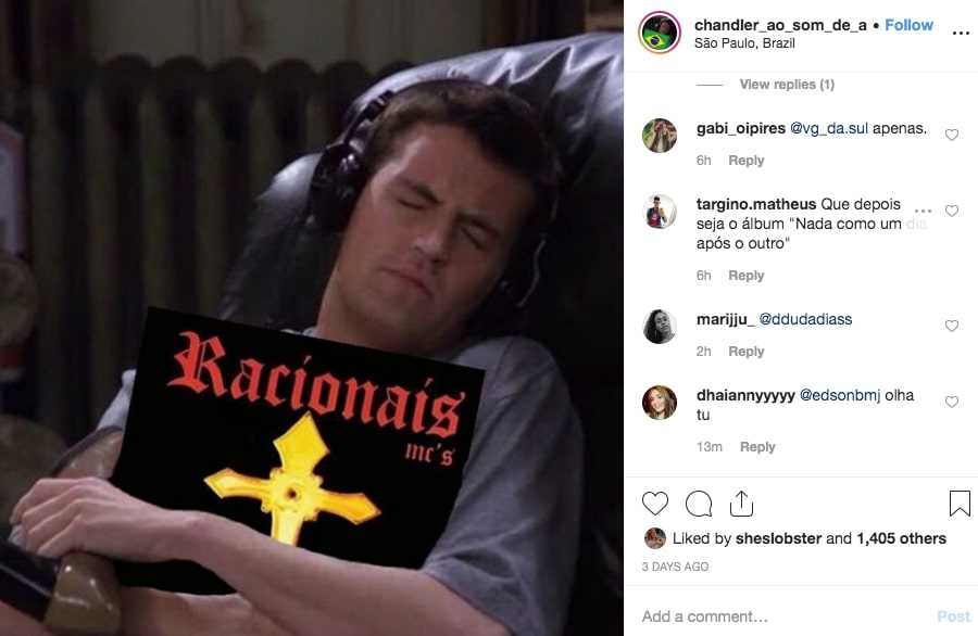 É claro que não demorou muito para uma conta chamada @ChandlerAoSomdeÁlbunsFoda fosse criara especialmente para postar montagens com discos nacionais. Tem Racionais, Ivete Sangalo, Tim Maia, Duda Beat, Sidoka e muito mais.