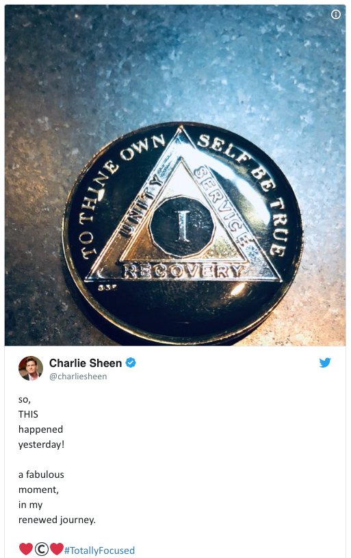 Na última terça, 11, o ator Charlie Sheen comemorou um ano de sobriedade publicando no Twitter uma foto da medalha que ganhou na clínica de reabilitação.