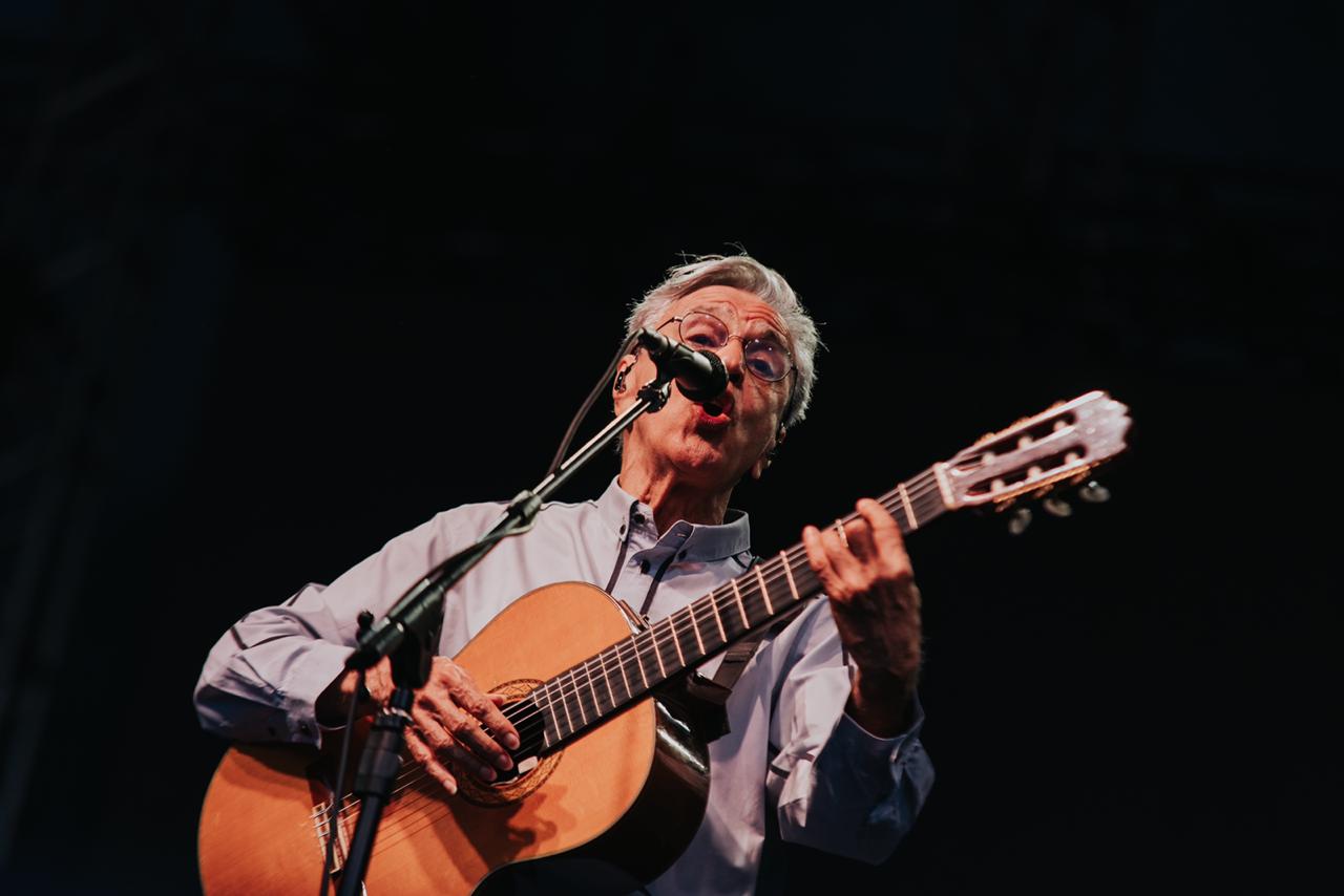 Mas isso não foi nem de perto o suficiente para intimidar o gigante da MPB que, aos 77 anos e com as mãos trêmulas, comandou uma multidão acompanhado apenas pelos dedilhados em um violão de cordas de nylon, uma taça de água e pelas plantas posicionadas ao fundo do palco que chacoalhavam de um lado para o outro com a ventania.