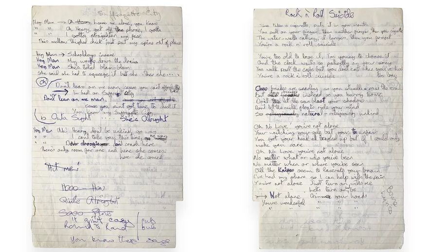 Páginas são rascunhos das canções “Rock N Roll Suicide” e “Suffragette City”