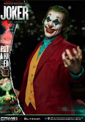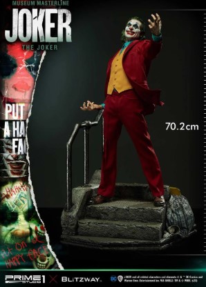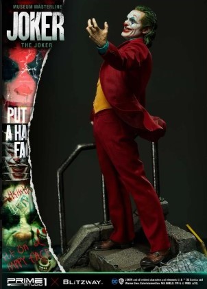 Esta estátua do Coringa é uma colaboração entre os estúdios Prime 1 e a Blitzway, como parte da série Museum Masterline. A representação se assemelha ao Arthur Fleck, de Joaquin Phoenix, inspirado na cena icônica da dança nas escadas do filme.