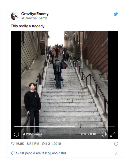 Um perfil no Twitter compartilhou um vídeo que mostra a escada bloqueada por pessoas fantasiadas, com câmeras e tripés. Na legenda ele escreveu: “Isso é realmente uma tragédia”. Assista aqui.
