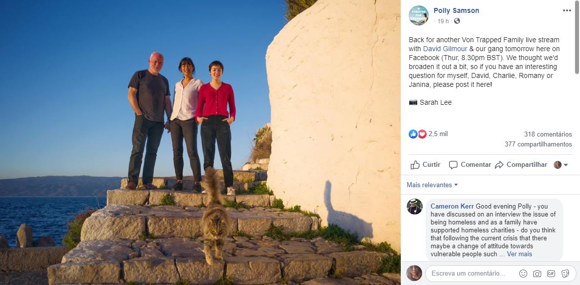“Voltaremos para outra live da família Von Trapped com David Gilmour e nossa gangue amanhã aqui no Facebook. Nós pensamos em estender um pouco, então se você tiver uma pergunta interessante para mim, David, Charlie, Romany ou Janina, por favor publique aqui!”